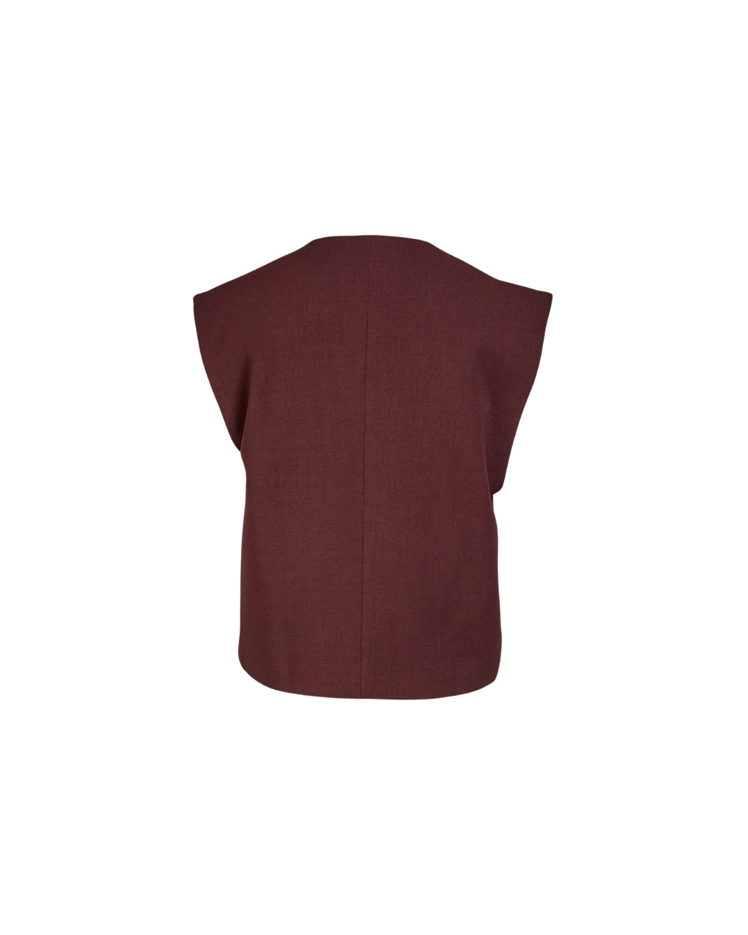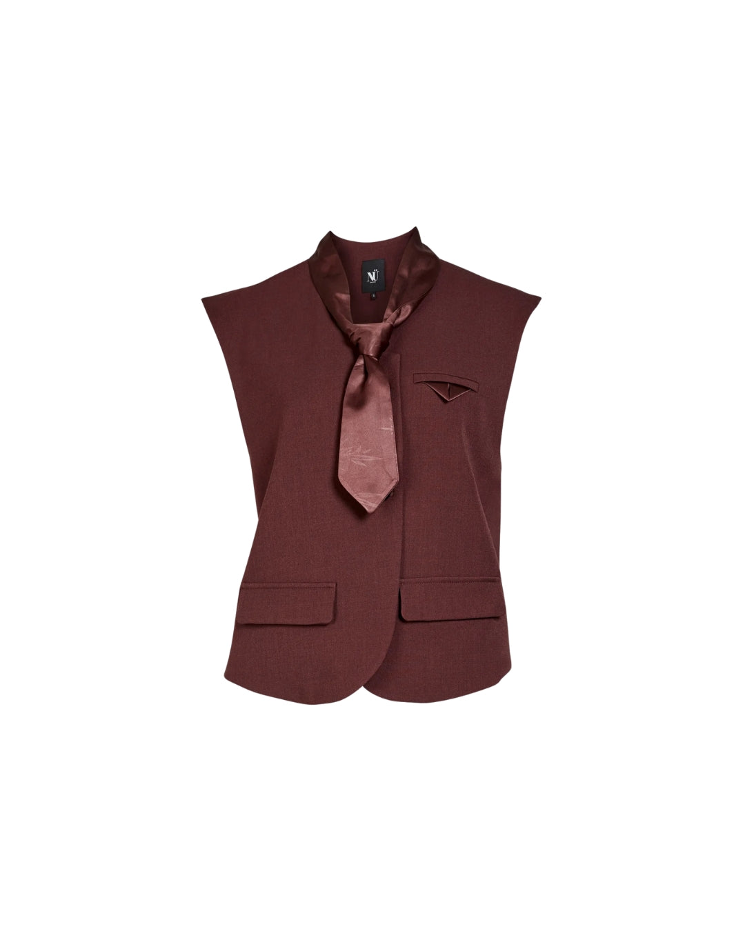 Diese Weste kombiniert klassische Schnitte mit stilvollen Details. Sie ist ärmellos mit einem runden Ausschnitt und hat eine lockere Passform, was sie ideal für den Layering-Look macht. Die Weste wird mit drei Knöpfen geschlossen und hat zwei aufgesetzte Vordertaschen sowie eine dekorative Brusttasche mit kontrastierendem Futter. Das enthaltene Satinbindedetail verleiht einen modernen und exklusiven Touch.