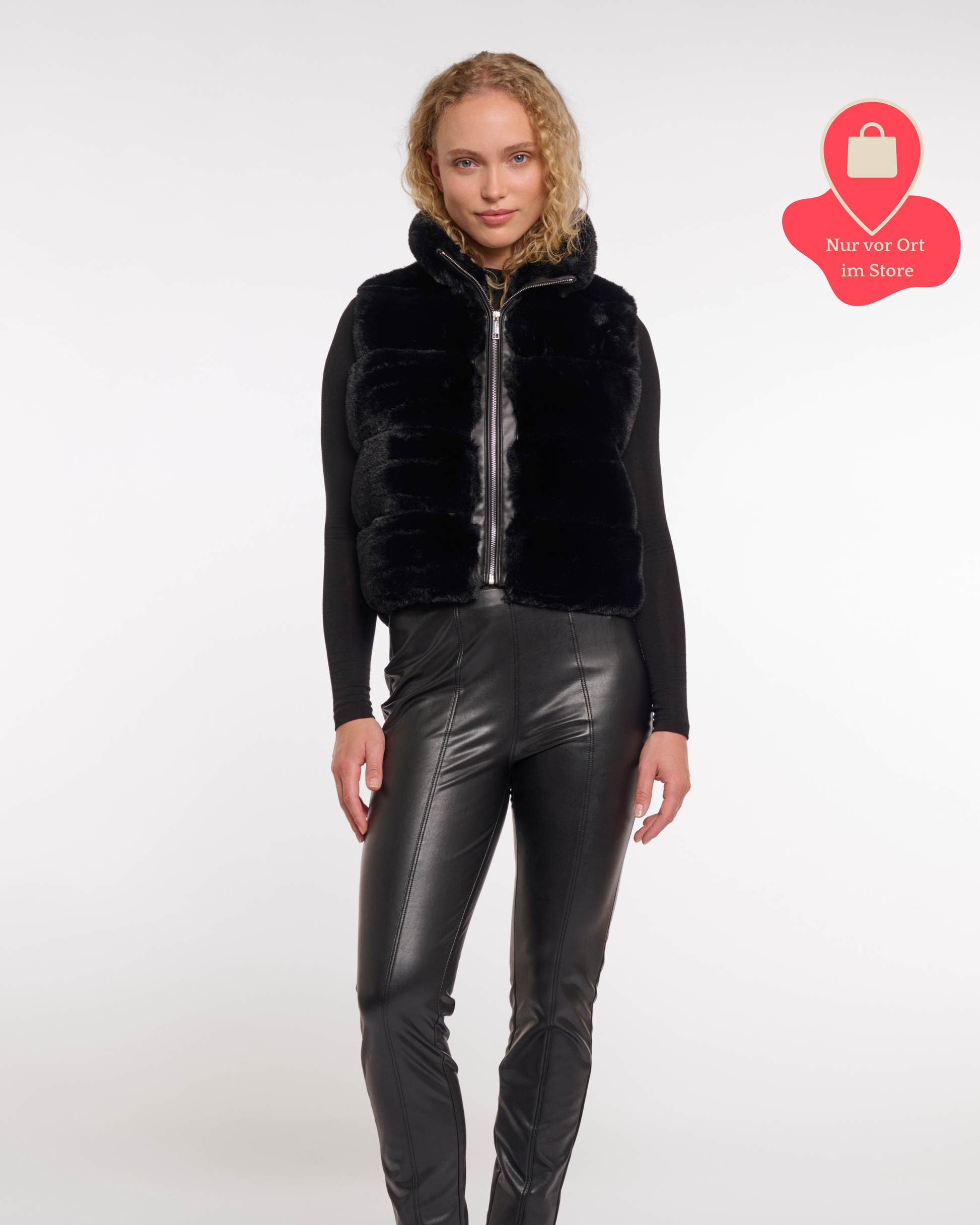 Stilvoll auftreten mit dieser schlichten, kurzen Weste. Gefertigt aus weichem, greifbarem Kunstfell und mit Details aus Kunstleder. Diese Weste verfügt über einen eleganten Reißverschluss, praktische seitliche Schlitztaschen und einen Stehkragen.